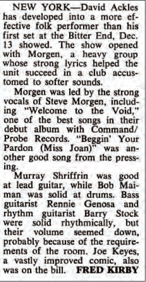 Do určité míry – chci říct, v prosinci dali reklamu do Rolling Stone a Record Hunter v New Yorku měl plnou výlohu našich desek. Když o tom mluvím, nemám ponětí, kolik kusů vlastně bylo vylisováno. Ale vzhledem k tomu, že album vyšlo o rok později než mělo, měli jsme štěstí, že bylo vůbec vydáno. Vzpomínám si, že jsem dělal v ABC rozhovor pro press release, ale netuším, jestli to vůbec pustili ven. Každého se nás ptali, kdo jsou naši oblíbení hudebníci a textaři a Murray odpověděl „Steve Morgen“. Naprosto mě to dostalo a hodně to pro mě znamenalo. Joe Carlton byl nadšený z té vší pozornosti, které se nám dostávalo v rádiích a o něco později mi Probe nabídli smlouvu na další desku. Joe mi řekl, že ve mě vždycky věřil a že svým dětem pouštěl vše co na Probe vydali a Morgen se jim líbil nejvíc! Někde jsem četl, že jsem zpíval doprovodné vokály na desce Saint Steven od Steva Cataldo, které vyšlo u Probe v roce 1969 a myslím, že si vzpomínám, že to tak opravdu bylo…